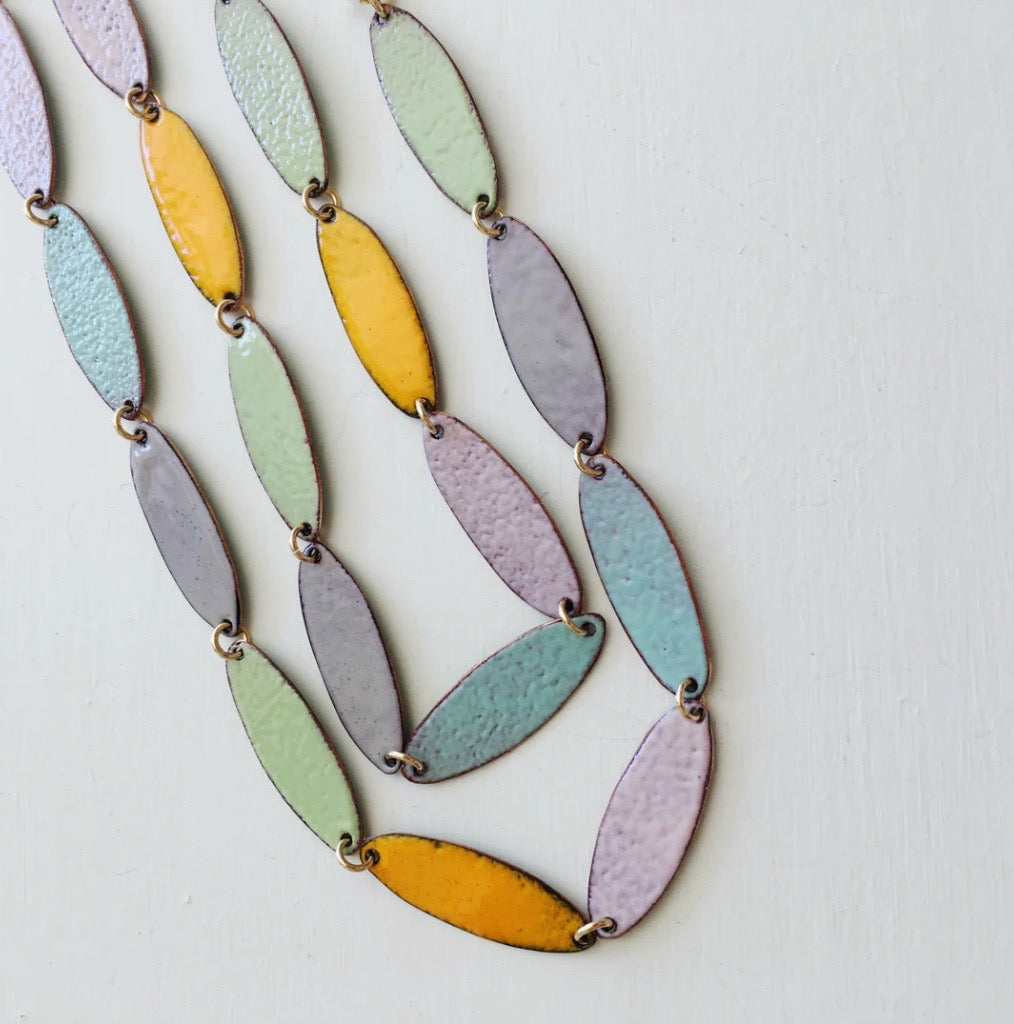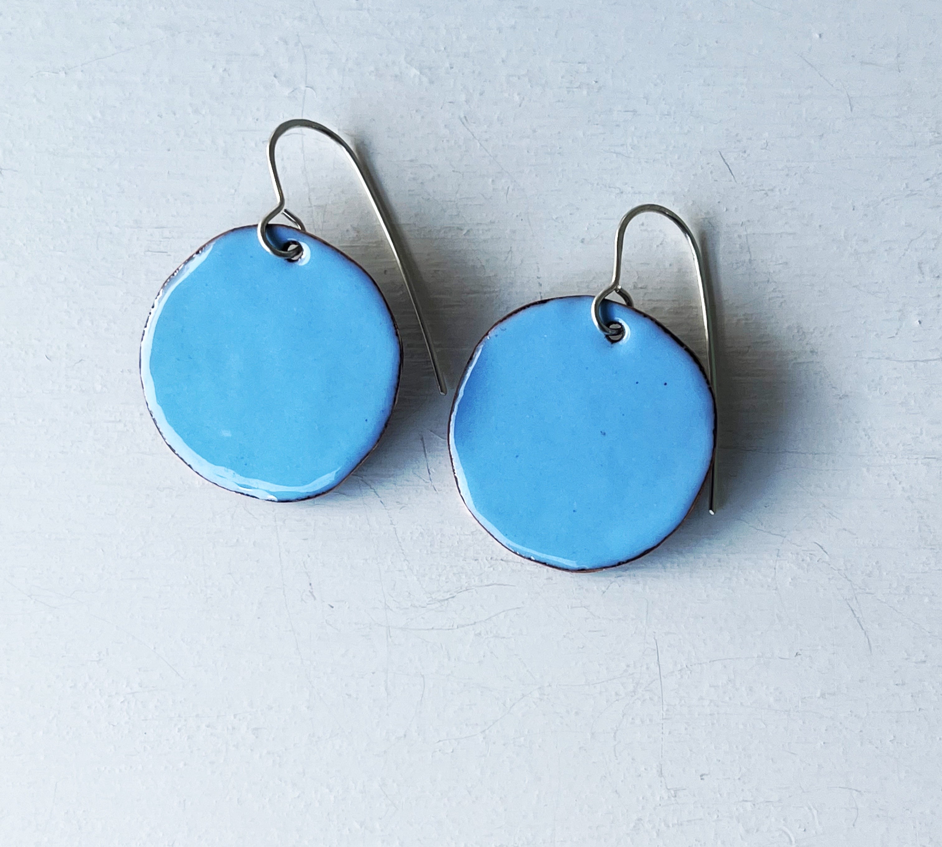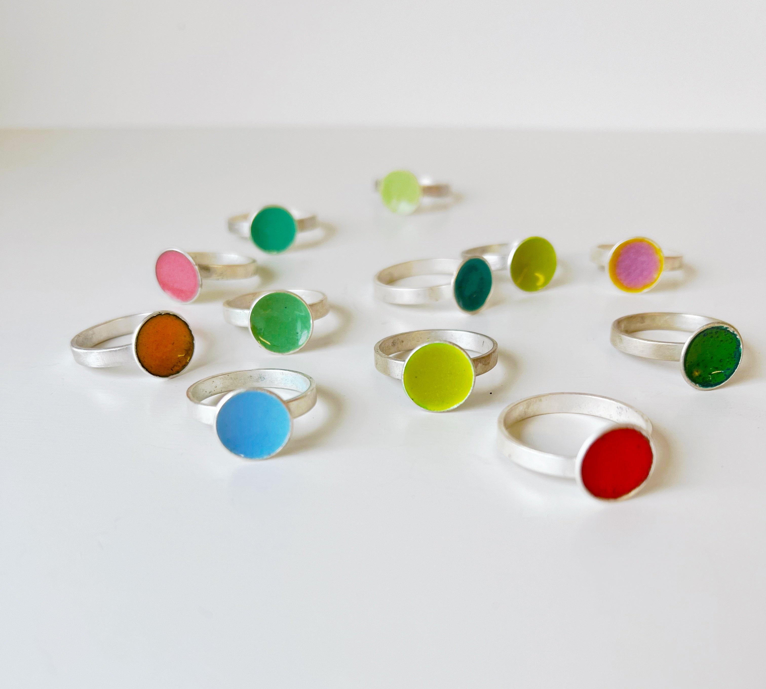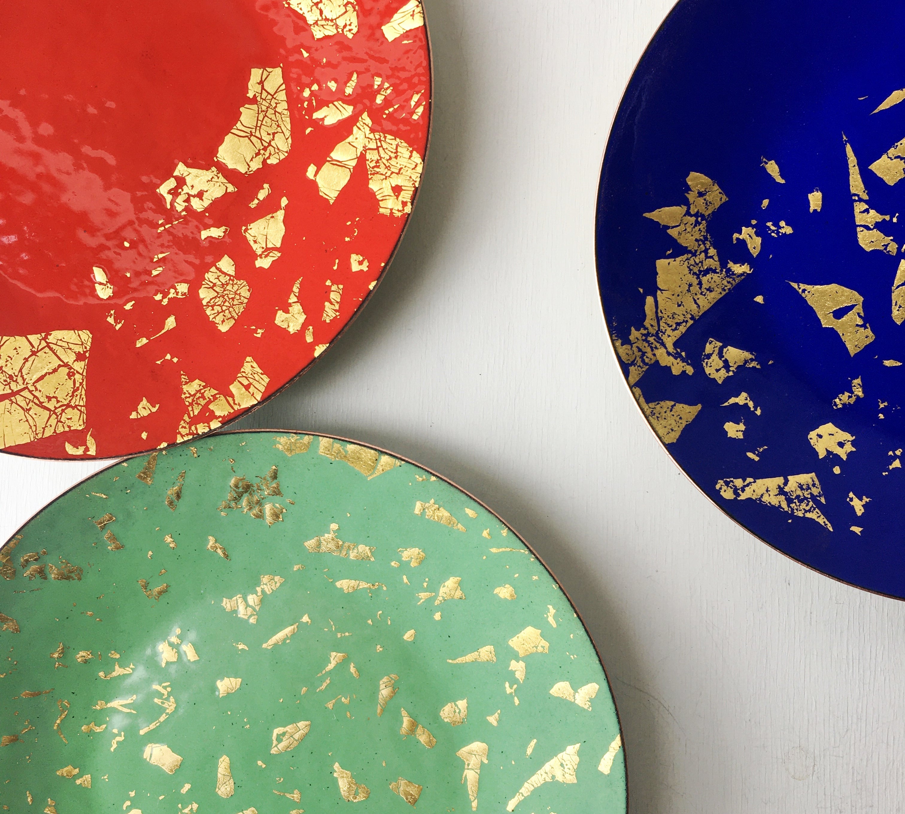 A thin layer of kiln fired glass on copper. Sometimes sterling silver.
