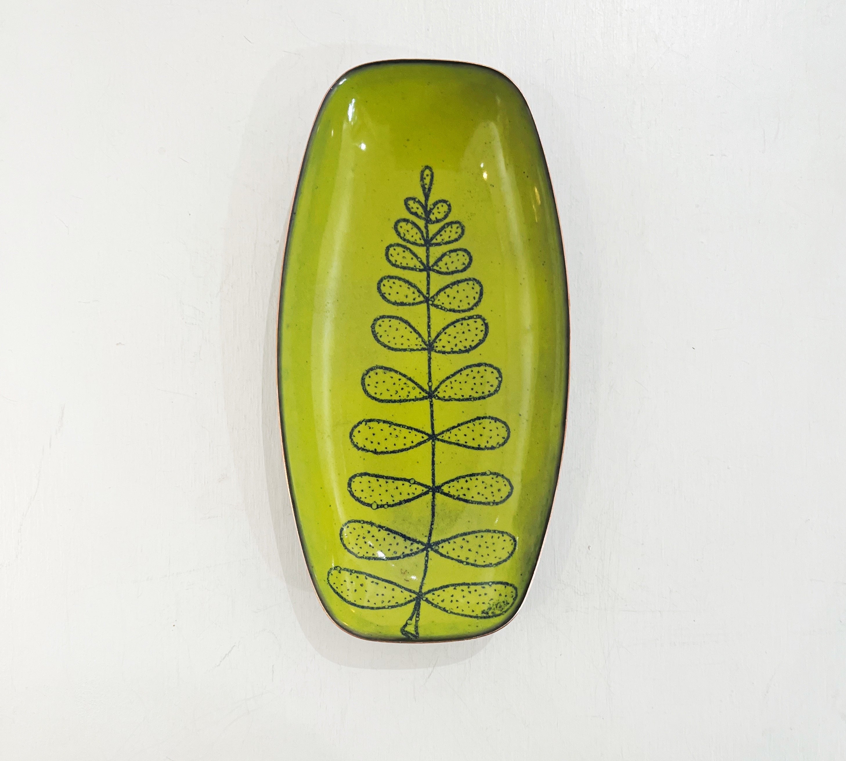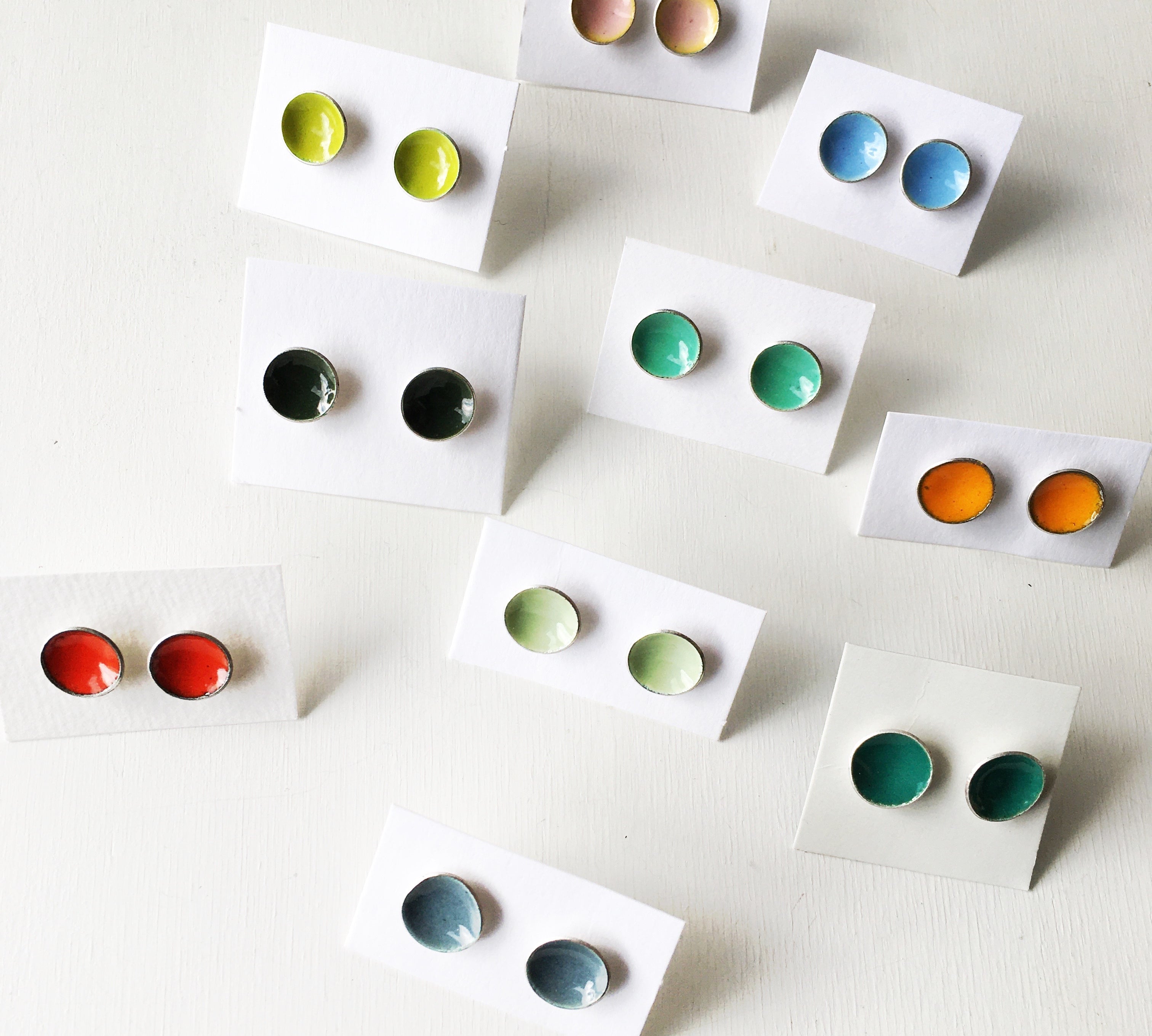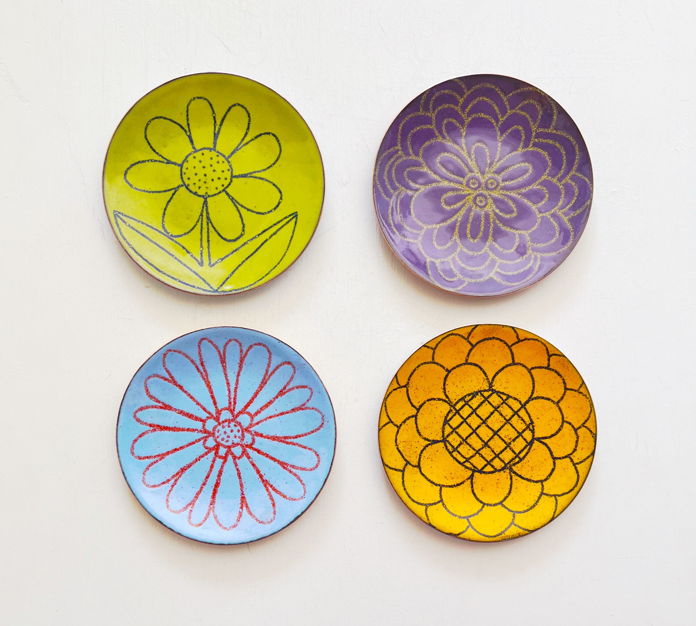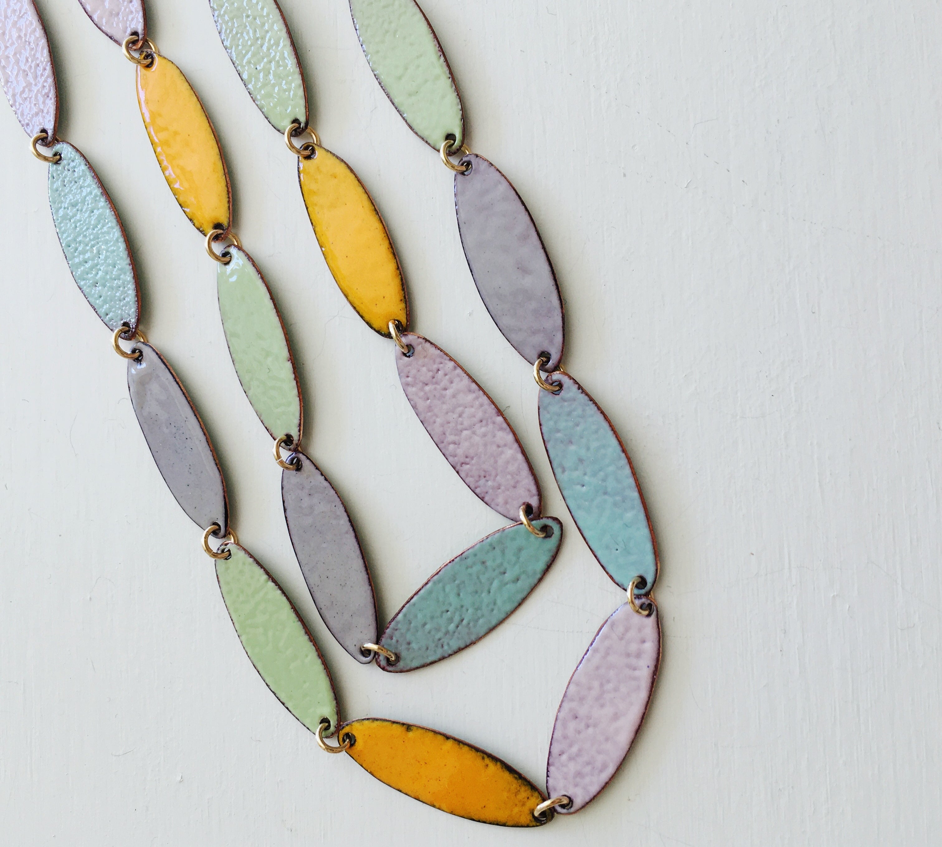 A thin layer of kiln fired glass on copper. Sometimes sterling silver.