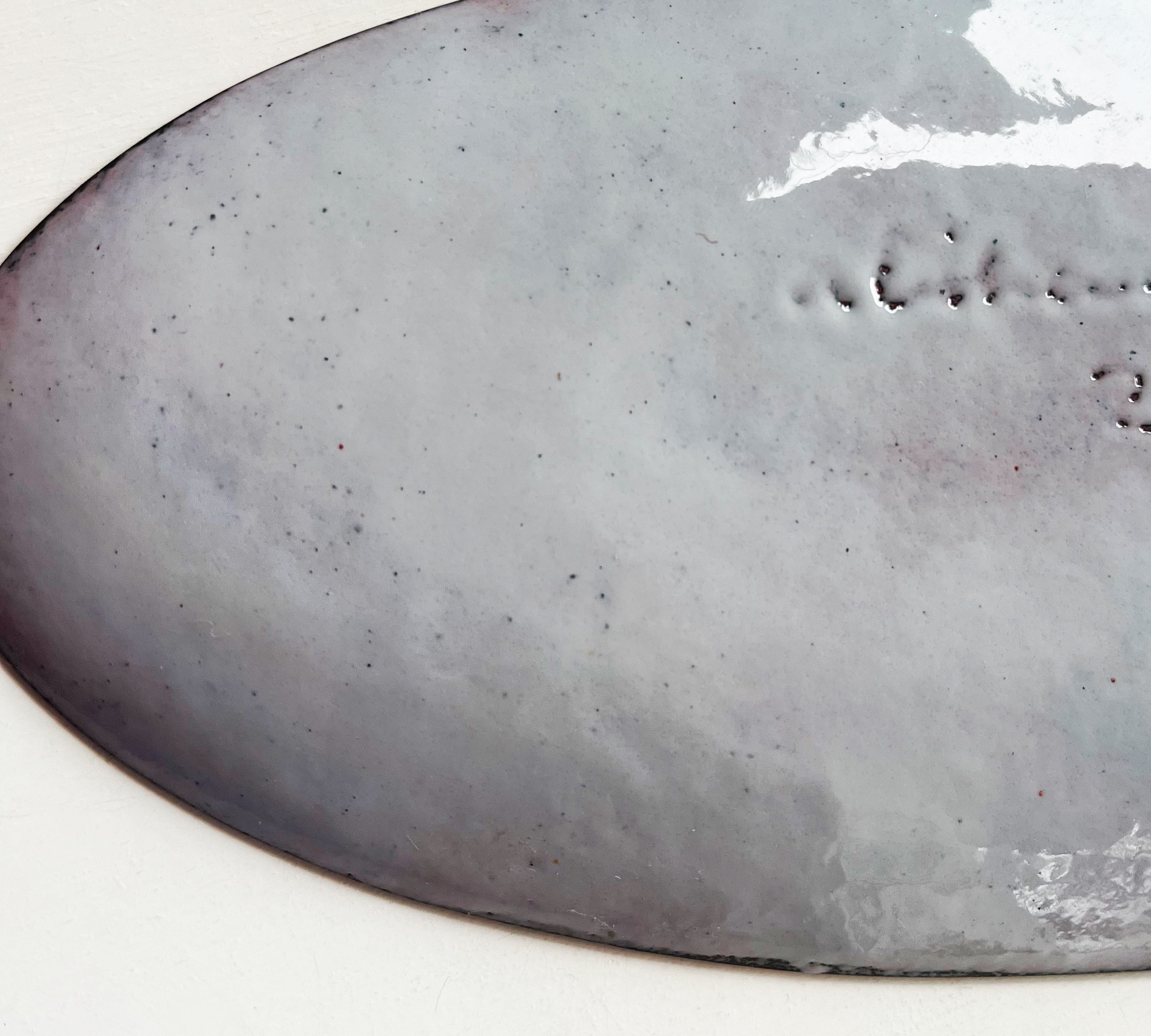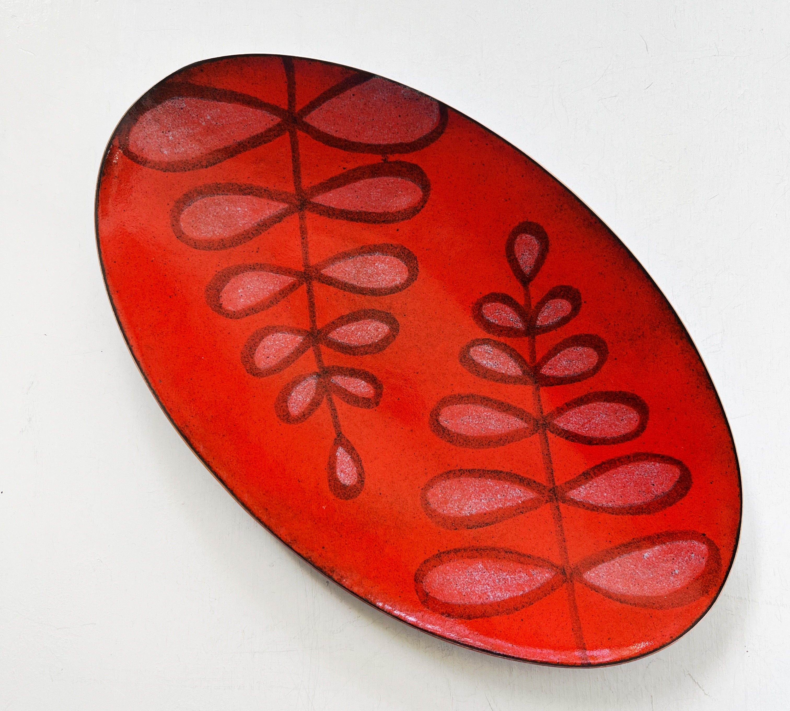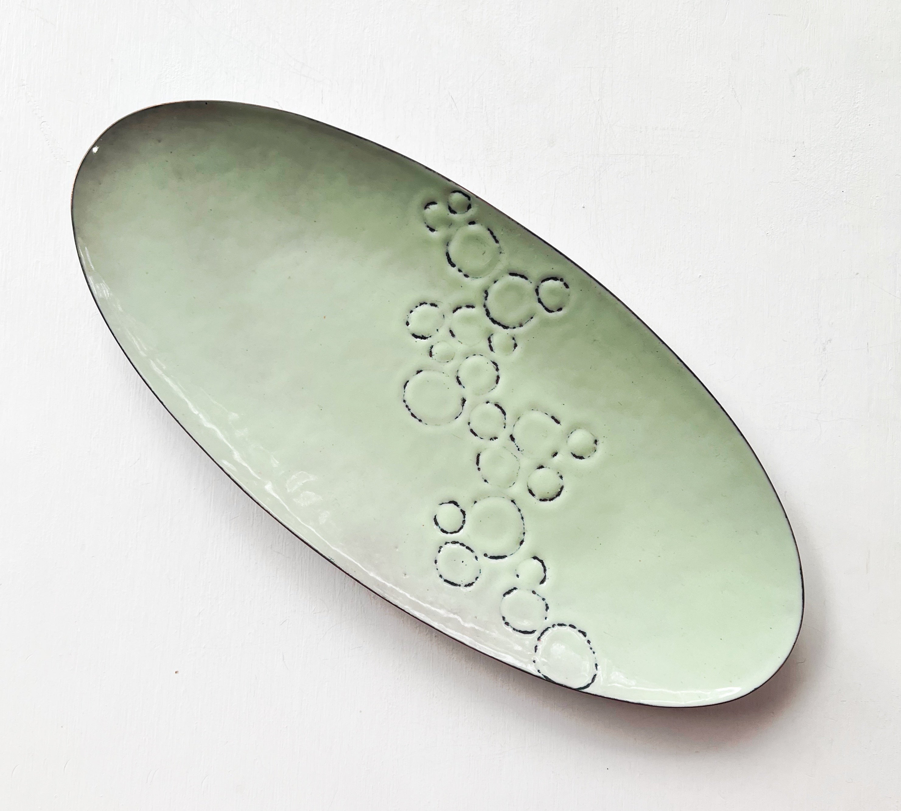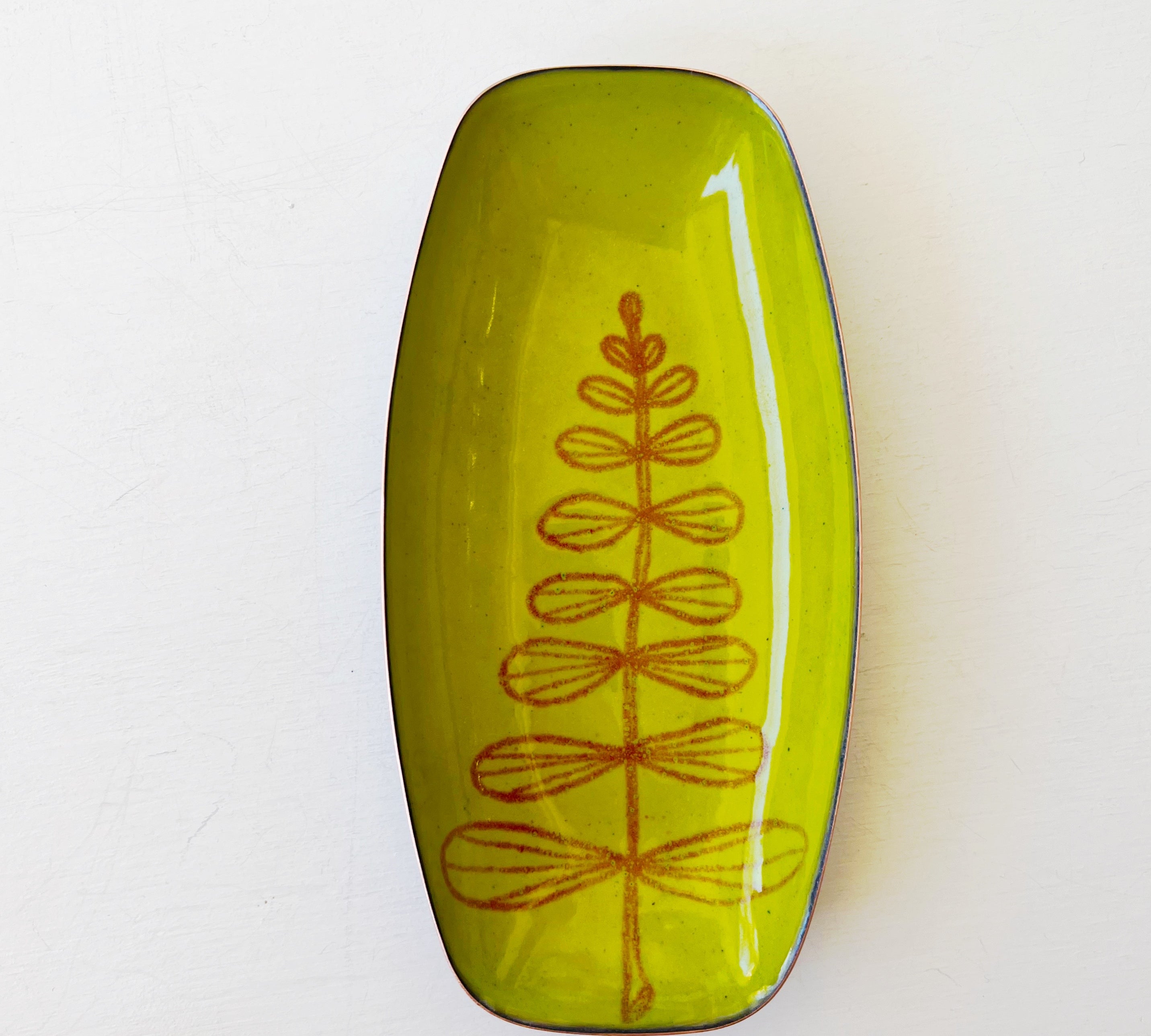 A thin layer of kiln fired glass on copper. Sometimes sterling silver.